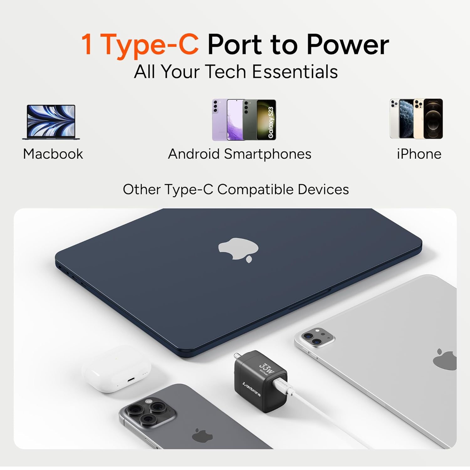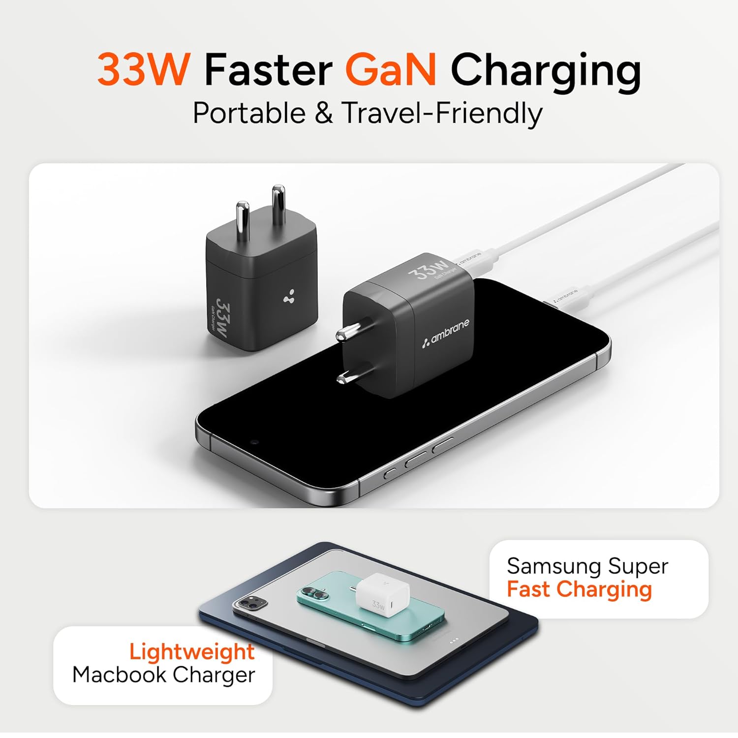Ambrane 33W GaN Fast Charger Adapter with PPS & PD Technology | Type-C Fast Charging for iPhone 17/16/15/14 Series, Samsung S24/S23/S22,Google Pixel Phone & All Type-C Devices
