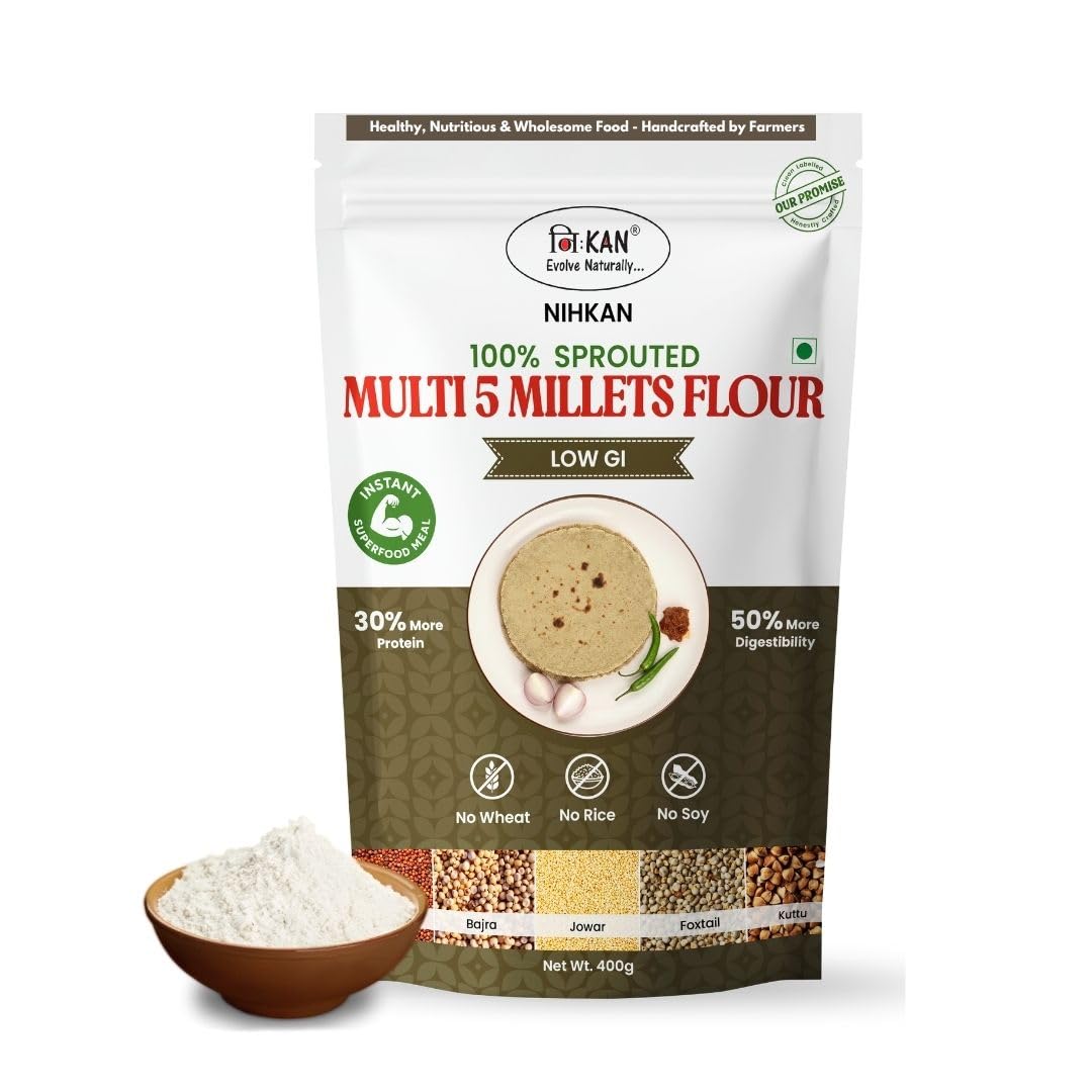 NIHKAN Multigrain Sprouted Millets Flour – 400g | Sugar Control Atta For Weight Loss & Diabetes | Gluten Free, No Wheat, No Rice, Low GI | Mix of 5 Sprouted Millets Ragi, Jowar, Bajra, Foxtail millets