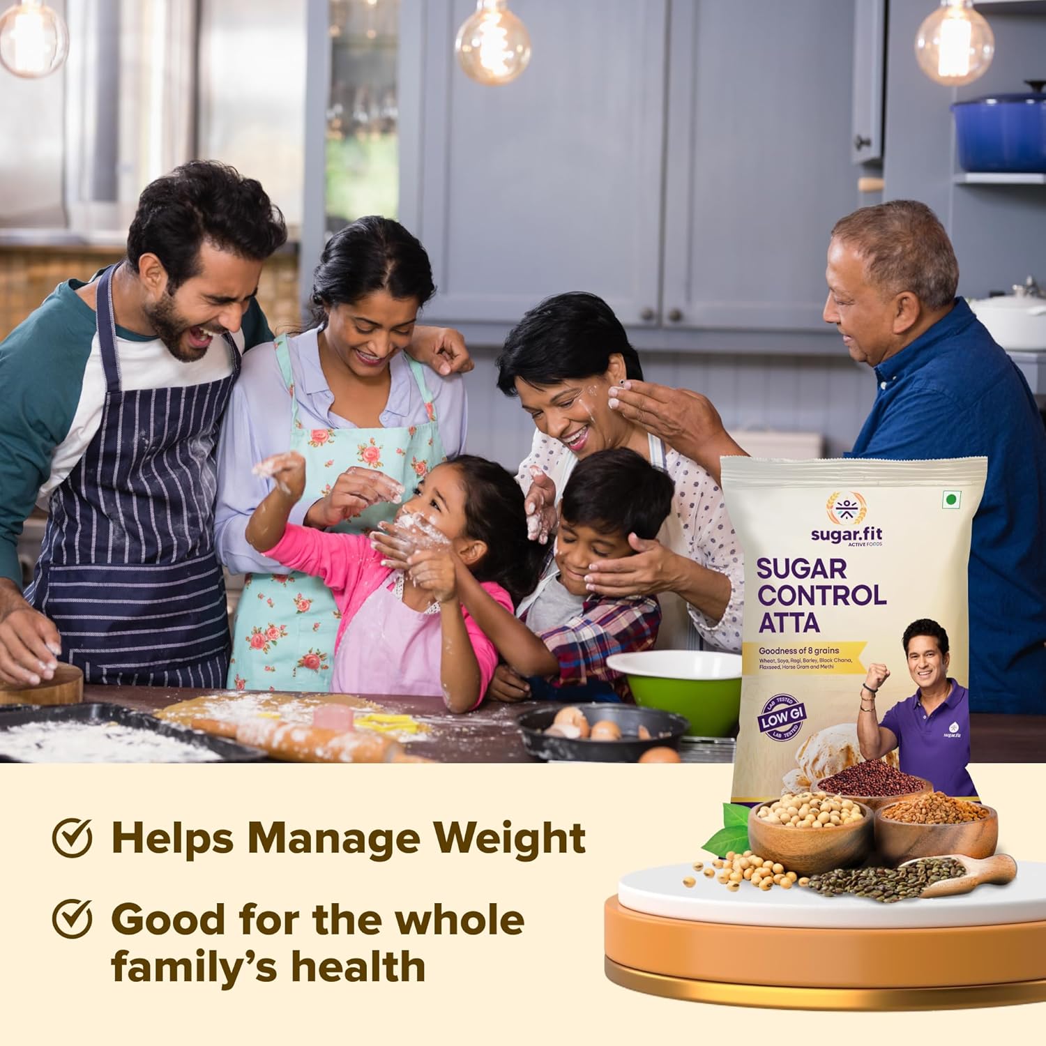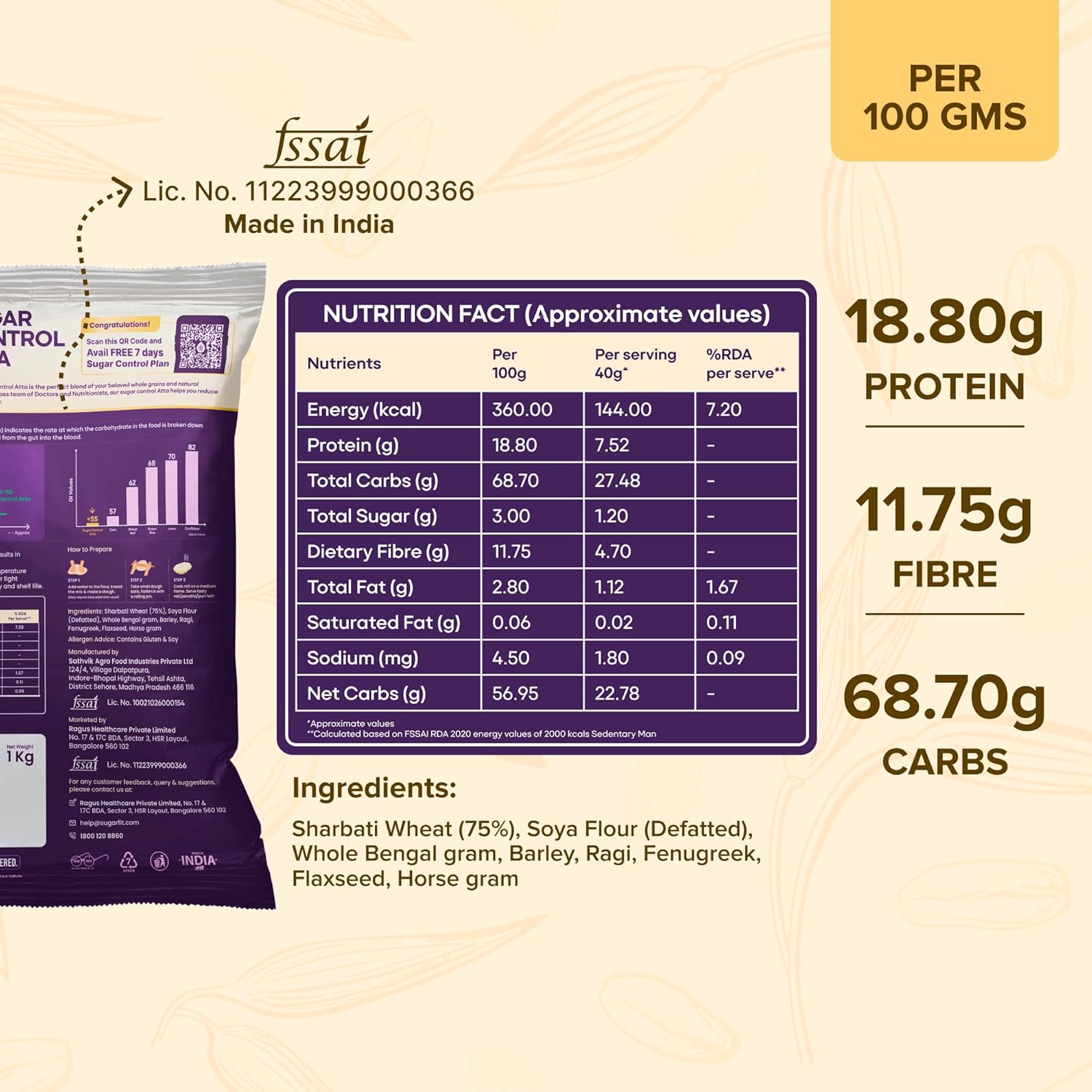 Sugar.fit Sugar Control Atta – 8-in-1 multigrain flour, sharbati wheat, ragi, millets, soybean, fenugreek & more, diabetic-friendly, 20% lower GI , high protein & fiber, healthy weight – 5 Kg (Pack of 1)