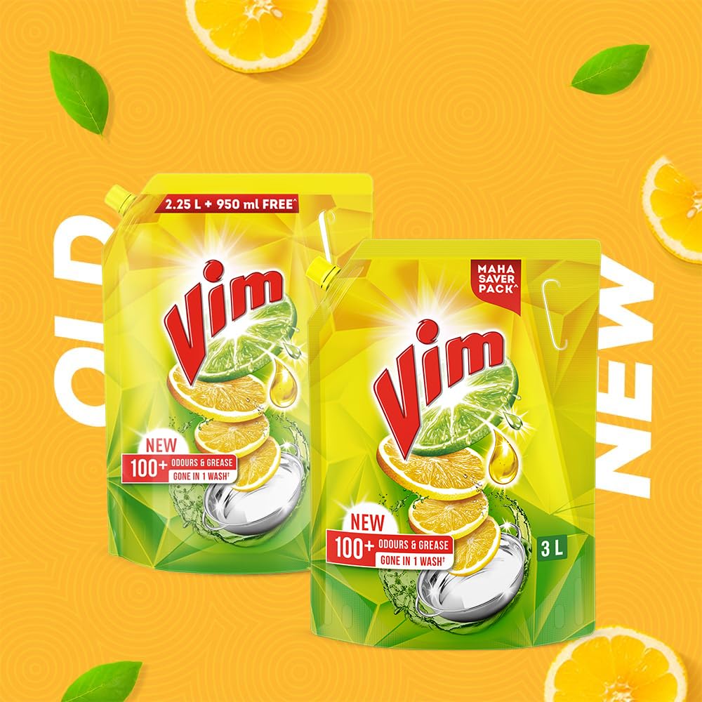 Vim Dishwash Liquid 3L pouch | Removes 100+ Odours & Grease in 1 wash | With the power of 100 Lemons |