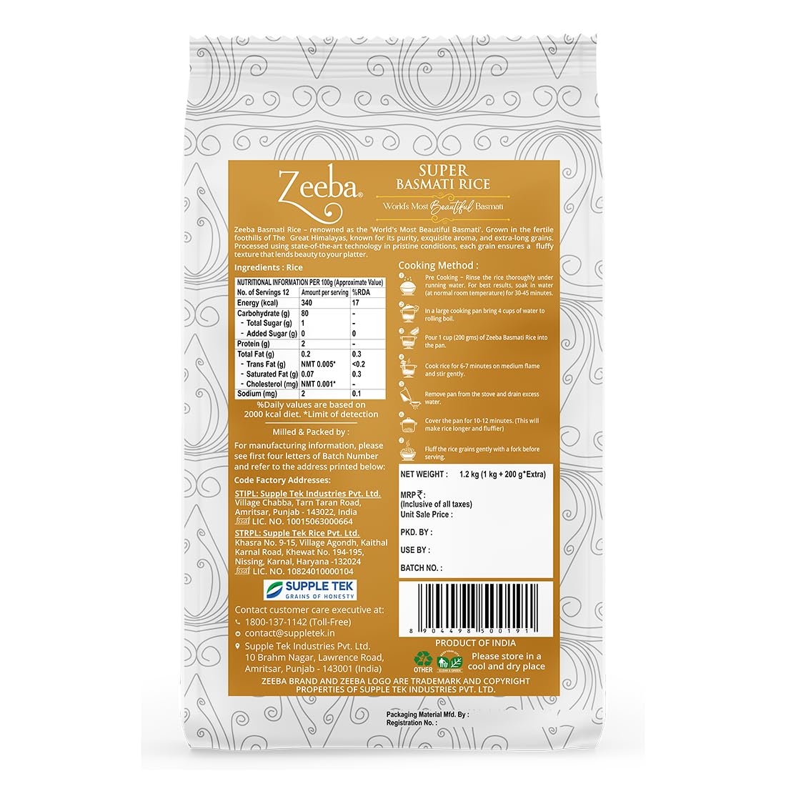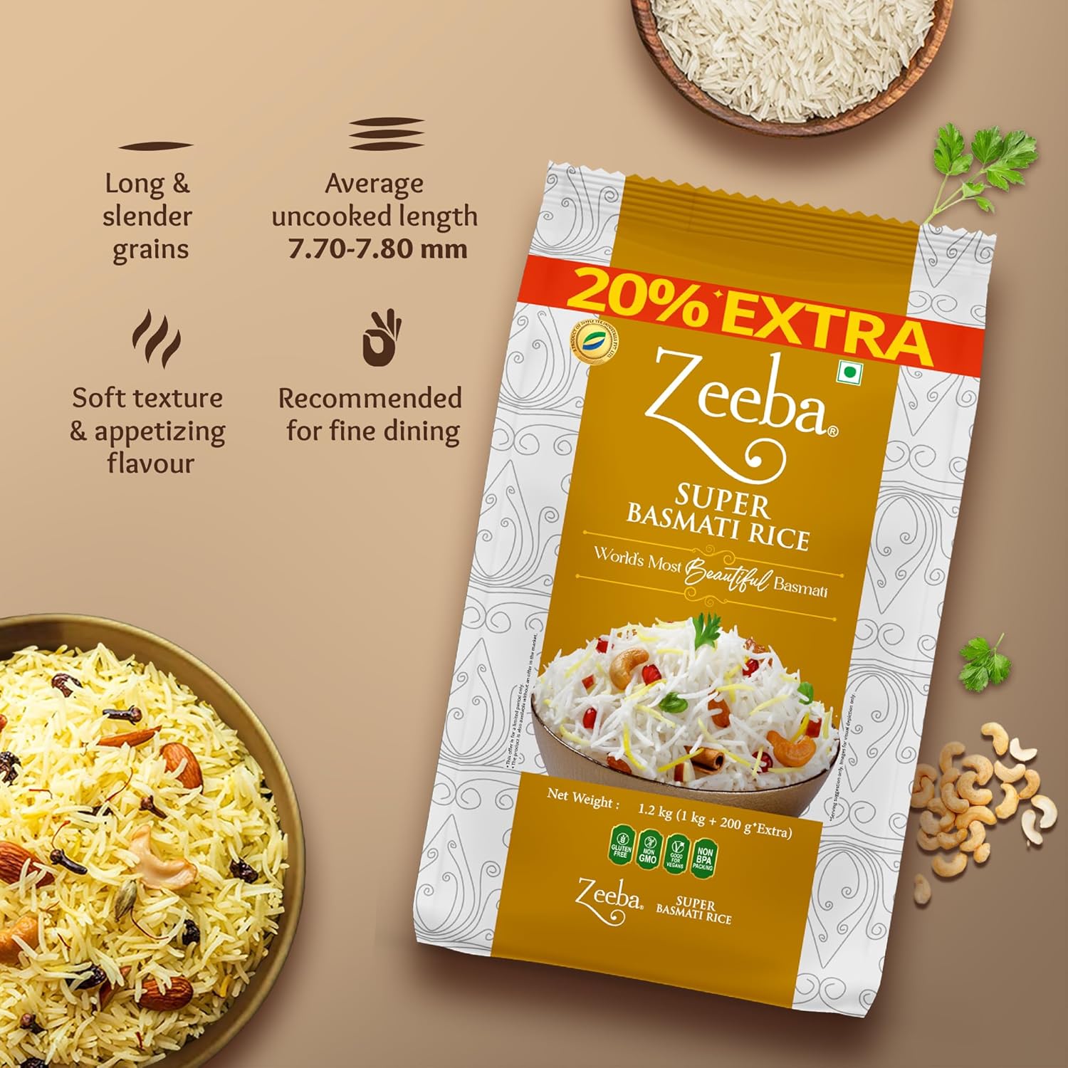 Zeeba Super Basmati Rice 1.2 Kg, Fluffy & Naturally Aromatic, Gluten Free Fine Grains (Cooked length upto 23mm*)
